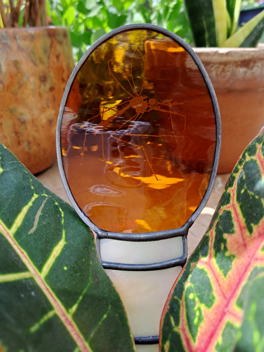 Jurassic Park Inspired Stained Glass 'Mosquito in Amber' Plant Stake Suncatcher - John Hammond Walking Stick Cane, Handmade Dinosaur Gift