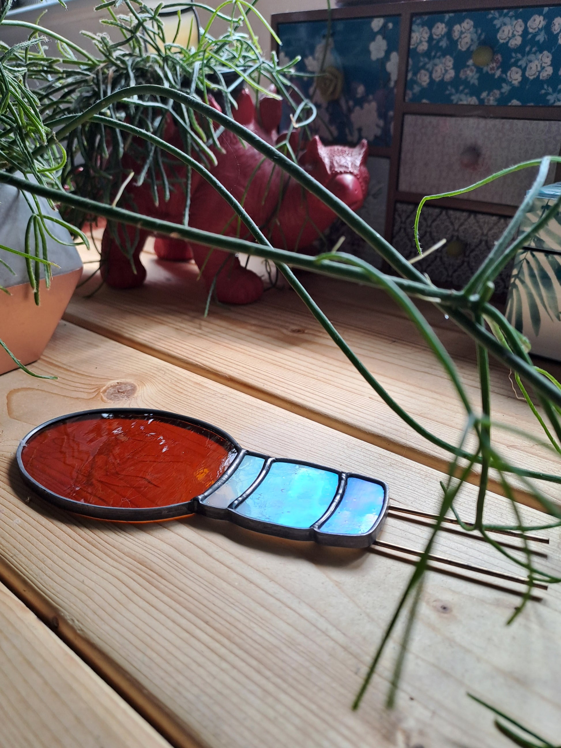 The piece is constructed in the 'Tiffany' copper foil tradition with a 'lead came' surround giving a crisp finish and added strength. Two lovely brass prongs are affixed firmly to the rear on the bottom edge to hold the steak upright in the soil. It looks as if Mr Hammond has carelessly left his cane sticking out of your plant pot!